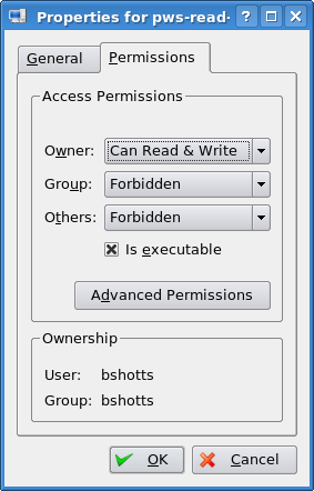 | -rw------- | A regular file that is readable and writable by the file's owner. No one else has any access. |
