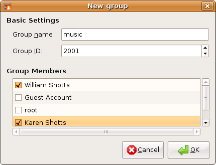 The first thing that needs to happen is creating a group that will have both bill and karen as members. Using the graphical user management tool, bill creates a group called music and adds users bill and karen to it:
