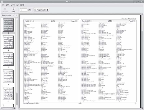 Note: a2ps is still in active development. During my testing, I noticed different behavior on various distributions. On CentOS 4, output always went to standard output by default. On CentOS 4 and Fedora 10, output defaulted to A4 media, despite the program being configured to use letter-size media by default. I could overcome these issues by explicitly specifying the desired option. On Ubuntu 8.04, a2ps performed as documented. Also note that there is another output formatter that is useful for converting text into PostScript. Called enscript, it can perform many of the same kinds of formatting and printing tricks, but unlike a2ps, it accepts only text input.